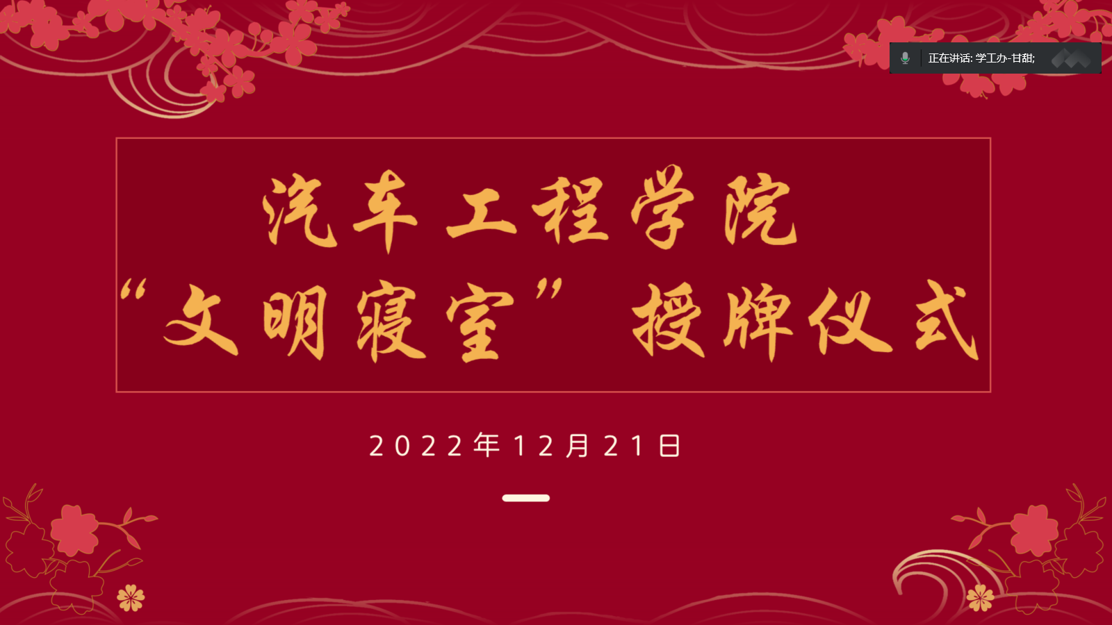 为进一步加强寝室精神文明建设,引导同学们争创学习氛围浓厚、整洁文明、舒适优美、文明和谐的居住环境,营造健康、积极、向上的员工宿舍文化氛围,太阳成集团tyc33455cc于2022年11月25日启动“文明寝室”创建活动,各年级同学积极参与。2022年12月21日晚,学院为在此次活动中表现优异的寝室举行了授牌仪式。太阳成集团tyc33455cc辅导员甘甜和各文明寝室成员代表参加了此次会议,会议以线上形式进行。