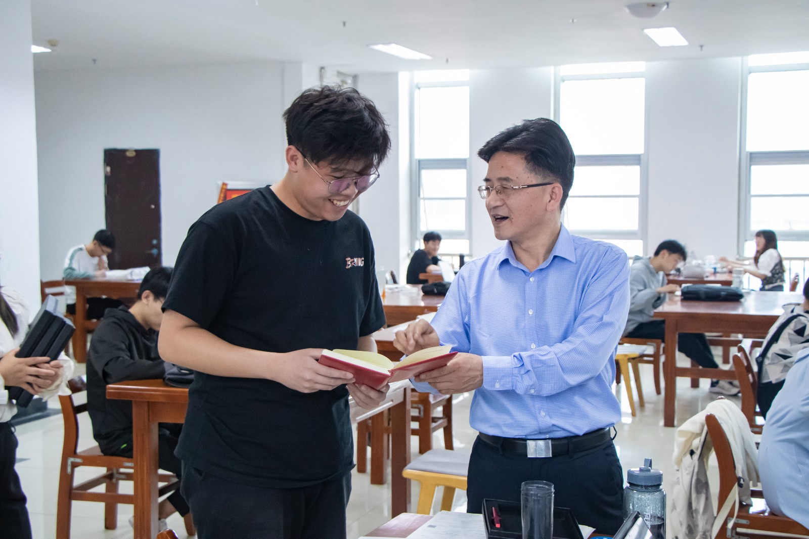 张文学直奔图书馆四楼自习室,边走边看员工们的复习情况。在20级考研员工集中复习区,张文学仔细询问了车辆203班金浩东同学的复习情况、班上整体的考研比例、择校方向和复习状态。当了解到当前存在员工考研专用教室匮乏、考研针对性辅导力度不足的问题时,张文学一一记录,并表示会尽快解决,尽全力为考研学子创造良好的学习条件和环境。随后,张文学为4名考研学子送上了亲笔签写祝福的笔记本,勉励在场考研学子,牢记习近平总书记嘱托,高扬理想风帆,肩负时代责任,刻苦学习、锤炼本领,勇敢追梦、提升自我。