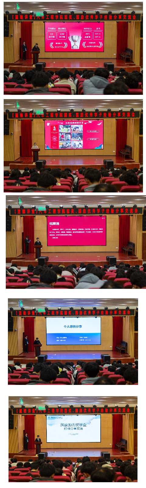 本次活动特邀请了五位国奖、国励奖学金获得者代表——本科2022级车辆工程专业姚全顺、汪子阳,车辆(中外合作)专业吴霜,新能源汽车工程专业彭一凡以及本科2023级新能源汽车工程专业罗明结合自身成长经历,深入浅出地从学习心得、学术成果、科研感悟和未来生涯规划等角度进行分享。