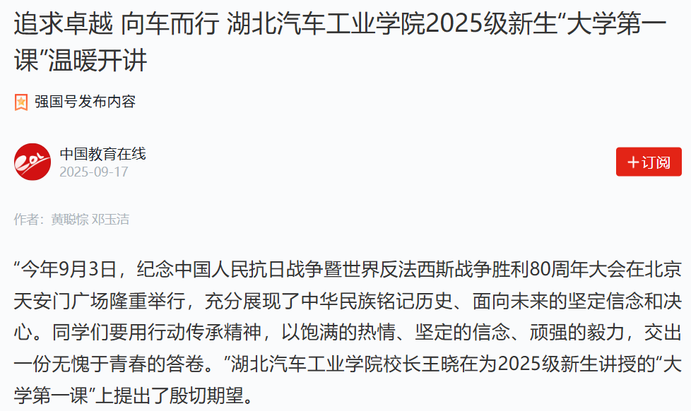 【中国教育在线学习强国号】追求卓越 向车而行 2025级新生“大学第一课”温暖开讲