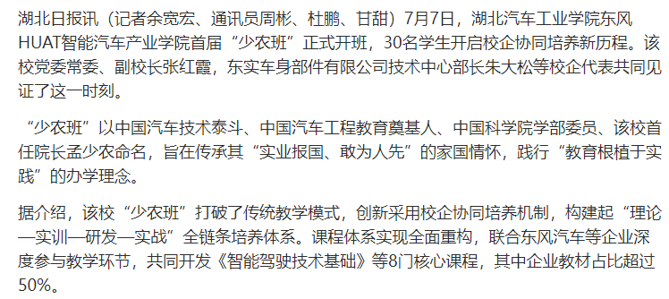 【荆楚网】湖北汽院设“少农班” 探索校企协同育人新模式